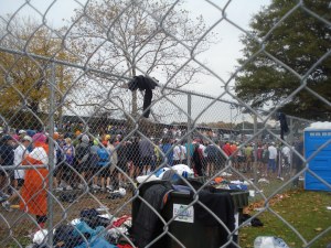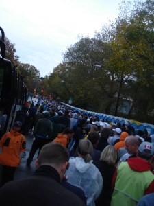 Race day! We had a 4:30am wake up call for a race that started at 9:40am. Slightly bleary-eyed we made our way to the lobby (as Jay rolled over and went back to sleep – smart man) which was teeming with people. Grabbed a coffee and headed to the subway which took us to the ferry to Staten Island. It was dark and raining and the best part was that there were as many people coming home from Hallowe’en parties as there were marathoners headed to the start.